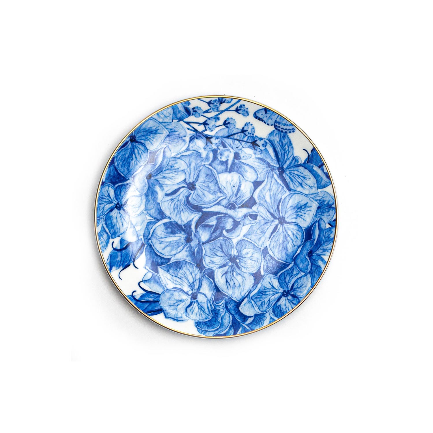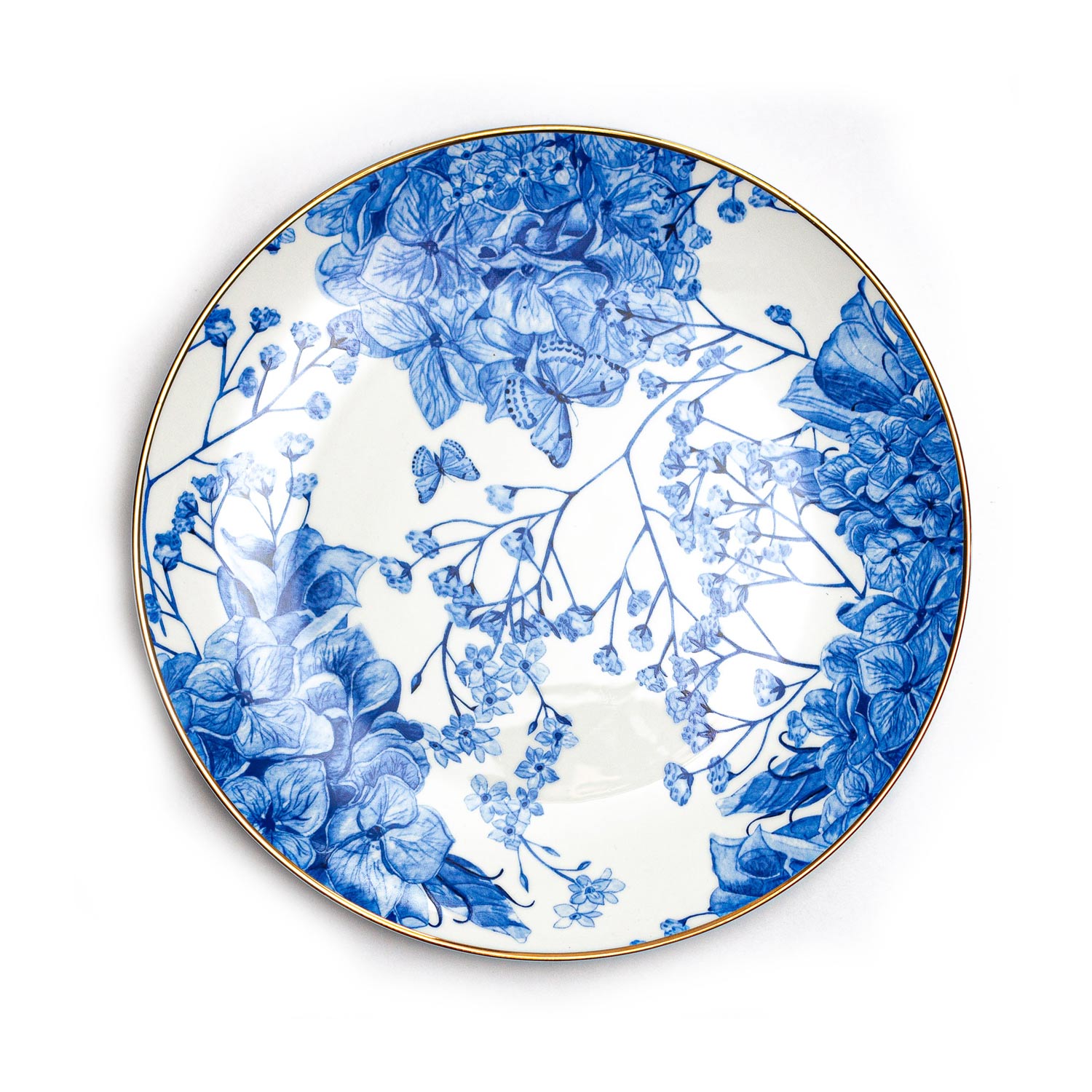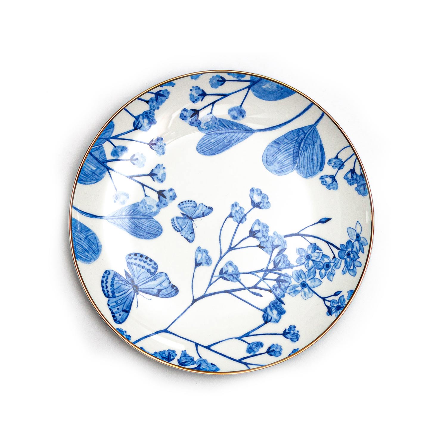 A classical style blue painted dinnerware finished with a gold edge. A fresh and elegant plate to lift your tablescape to beautiful heights.